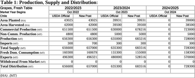 In MY 2024/25, Post estimates table grape production will increase by 6.6 percent, totaling 723,000 MT due to high yields and assuming no unexpected climatic events that could hinder production. Table grape yields will increase due to favorable climatic conditions, such as abundant rainfall and a high accumulation of chill hours in the winter.
