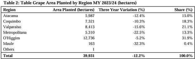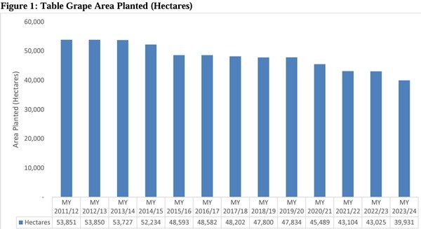 In MY 2024/25, Post projects a 2.3 percent reduction in the area planted with table grapes, bringing the total to 39,000 hectares. The area dedicated to table grapes has been declining for over a decade due to narrow profit margins. Increased competition from other suppliers and low prices for traditional varieties like crimson, flame, and red globe have forced smaller table grape exporters out of the market.