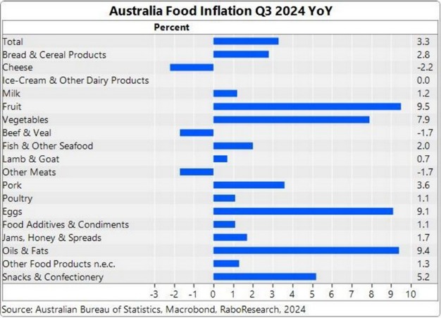 The recently-released September 2024 quarter data, saw overall annual food price inflation – comparing prices with the September 2023 quarter – remain at the same rate (3.3 percent) seen in the June quarter. Quarter on quarter, prices in the 'food and non-alcoholic beverages' category rose 0.6 percent.