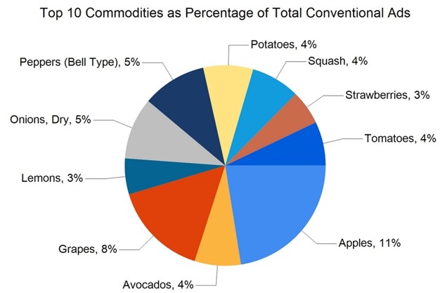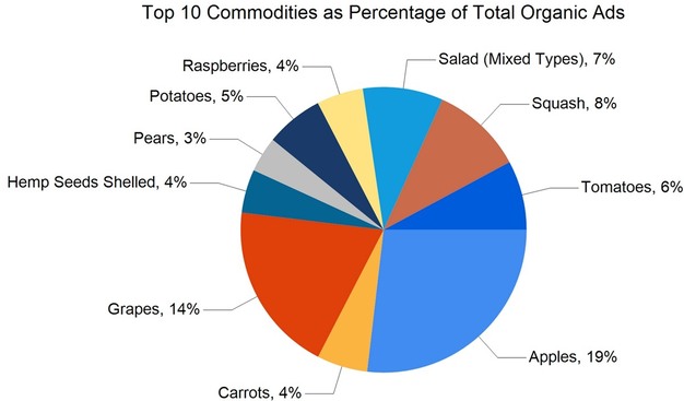 Total ad numbers this week were 280,786, a 7% decrease from last week's total of 301,737. The total for the same week last year was 2% higher at 285,800. The total number of ads broken out by commodity groups: fruit 146,515 (52% of all ads), onions and potatoes 24,474 (9%), vegetables 103,237 (37%), herbs 2,290, ornamentals 4,233, and hemp 2,327. The number of ads for organic produce was 32,940, 12% of total ads.