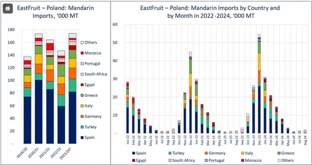 Poland's seasonal mandarin imports typically range from 140 thousand to 170 thousand tons, with this season expected to reach a record high. Spain remains the primary supplier of mandarins to Poland, although its share has been declining. Previously, Spain accounted for 54-58% of Poland's mandarin imports, but this has decreased to 40-47% over the past two seasons.
