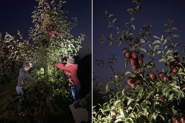 This year, too, Bio Obsthof Münch has once again harvested its popular full moon apples. "The conditions for the harvest on September 18th could hardly have been better: ideal harvest weather and a clear view of the bright full moon gave the event a special atmosphere. We have introduced the 'full moon pears' (the Novembra variety), which we have now harvested for the first time together with the moon apples," says operations manager Marco Bartels. "We have harvested 30 percent fewer moon apples than last year. Accordingly, the moon apple is expected to be sold out in January."