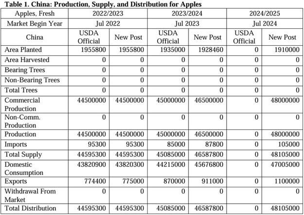 During a crop tour in Shaanxi and Shanxi, the first and fourth largest apple producers, Post observed that these two provinces will likely harvest fewer apples this year as they are encountering a low-bearing year. Furthermore, there are fewer apple trees in production, which will also impact those provinces' production. Apple crops in other major producing provinces, such as Hebei and Sichuan, are likely to improve slightly. Meanwhile, apple quality has generally improved from a year ago given favorable growing conditions in most production areas. Traders report that the share of high-grade apples will greatly increase from the previous year. Post-revised the production estimate upwards in line with industry expectations. Post expects the country's apple production to remain relatively stable in the future.