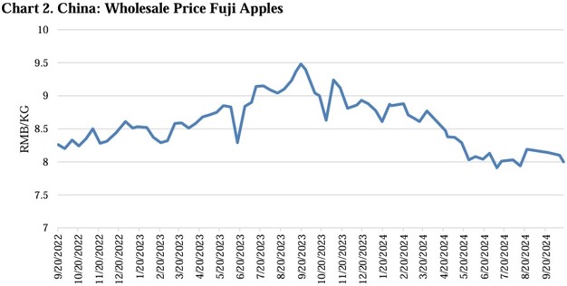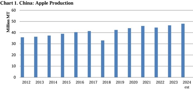 Post estimates China's apple production at 48 million metric tons (MMT) in marketing year (MY) 2024/25 (July-June), an increase of slightly more than 3 percent from the revised Post estimate for MY 2023/24. Except for rainfall during flowering and higher summer temperatures in some production areas, there have been no major weather abnormalities so far in 2024, which is the main cause of apple production growth. Good weather, and productivity increases from higher-yielding varieties and horticultural practices, combined with the removal of older low-yielding trees more than offset moderate declines in planted areas. The apple crop in Gansu, the third largest producing province, is recovering from MY 2023/24 when spring frosts seriously affected fruit set.