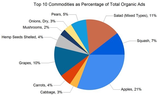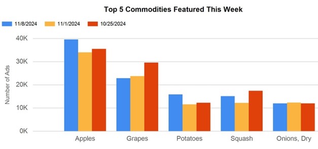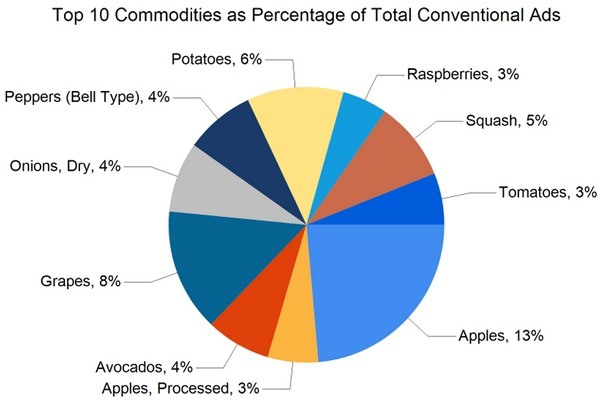 Total ad numbers this week were 289,775, a 3% increase from last week's total of 280,786. The total for the same week last year was 12% lower at 259,065 when Friday-breaking ads were not included due to the observance of Veteran's Day. The total number of ads broken out by commodity groups: fruit 154,360 (53% of all ads), onions and potatoes 27,968 (10%), vegetables 103,186 (36%), herbs 962, ornamentals 1,354, and hemp 2,907. The number of ads for organic produce was 37,579, 13% of total ads.