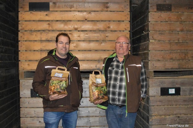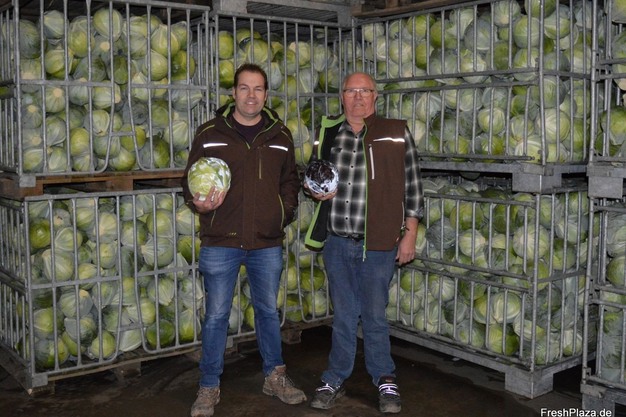 Hermann-Josef and his father Hans-Wilhelm in the cabbage storage. The family business supplies food retailers and wholesalers, as well as industrial and processing companies.