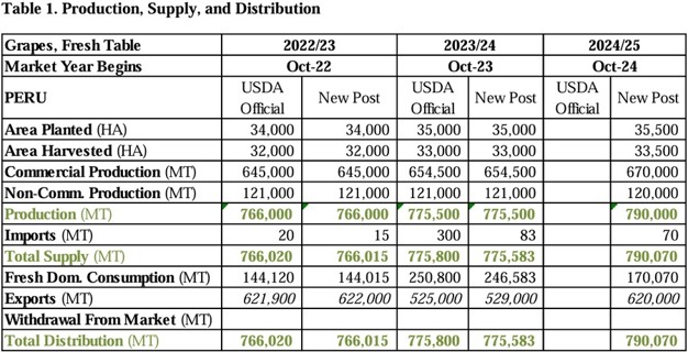 Grape production in Peru is forecast to reach 790,000 metric tons (MT) in marketing year (MY) 2024/2025, an increase of two percent compared to the previous year. The expected increase is due to improved climatic conditions in northern coastal regions which represent 48 percent of the total production area. Domestic consumption of fresh grapes is forecast at 170,000 MT in MY 2024/2025, a decrease from last year due to higher international prices. Peruvian grape exports are forecast to reach a record of 620,000 MT in MY 2024/2025, a 17 percent increase from the previous year. The United States will continue to be the lead export market.