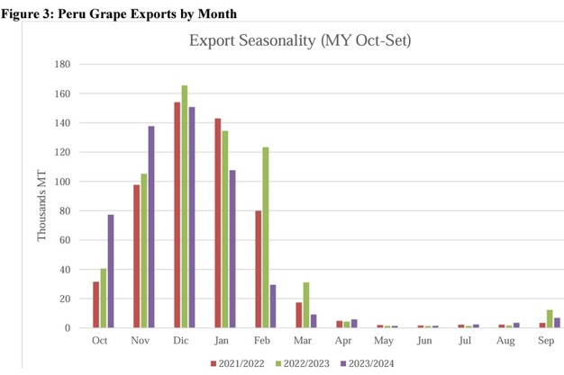 Grape production is mainly located in Ica (49 percent) and Piura (37 percent). Other relevant areas are Lambayeque (6 percent), La Libertad (5 percent), and Arequipa (3 percent). The total area under cultivation is estimated at 35,500 hectares. The harvesting season in Peru begins in October and ends in April with a North-to-south harvest pattern. With innovative technological advances, table grape production in Piura can be harvested twice a year, once in March/April and again in November/December.