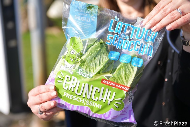 "Crunchy is the brand name of an innovative lettuce that Fellini grows in Italy, in different areas, so that it can be available all year round. It is a product that combines crunchiness and sweetness, the packaging is eye-catching and it is sold at the guaranteed minimum weight of 300 grams per pack."