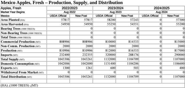 Post's total production forecast for MY 2024/25 is 817,000 metric tons (MT), slightly above the large crop estimate in 2023/24 of 816,533 MT. In MY 2023/24, Mexico's apple production increased 28.9 percent from the 2021/22 season, a recent low point, due in large part to post-harvest technology investments such as atmosphere-controlled storage. However, Post´s forecasted increase in production is tempered by the prevailing trends such as an overall reduction in chill hours received by orchards throughout the season which is key for fruit development and overall orchard health.