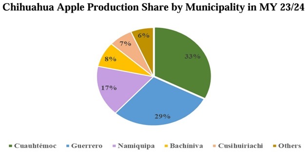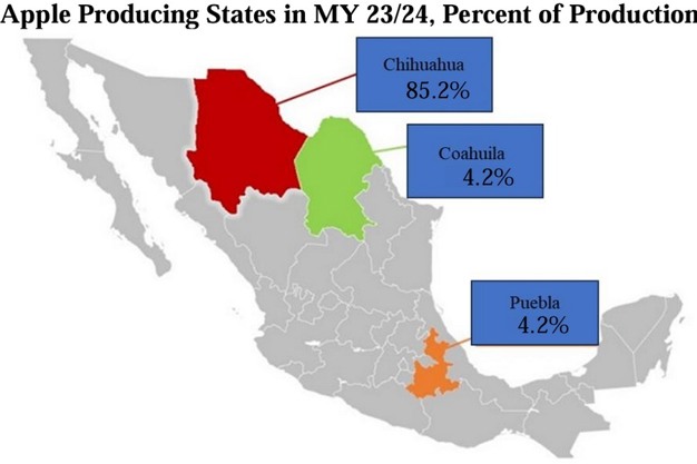 The states of Chihuahua, Puebla, and Coahuila account for over 93 percent of Mexican apple production. Chihuahua alone accounts for an estimated 85 percent of production. Without major growth in other states, Chihuahua will remain the primary cultivation area and is key to understanding Mexico's national apple production. Given the higher temperatures and aridity experienced in Northern Mexico versus other apple-producing regions of the world, one of the key factors allowing for successful commercial apple production in Chihuahua is the higher elevation of many of the production zones. Of the three top-producing municipalities (Cuauhtemoc, Guerrero, Namiquipa) all are over 6,000 feet in elevation, with some cultivation zones well over 7,000 feet, which provides the periodic cooling needed for commercial orchards to produce.