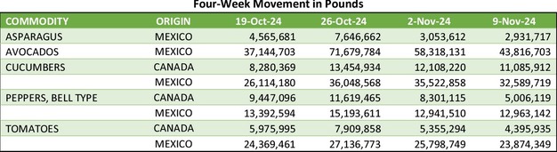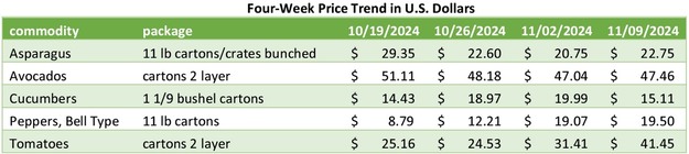 Movement from Peru imported through South Florida ports of entry is expected to increase. Trading is moderate. Prices are slightly higher. 11-pound cartons of bunched jumbo are mostly 28.85-32.75, extra-large are mostly 24.85-27.75, large are mostly 22.75-24.75, standard are mostly 20.00-22.75, and small are 17.75-18.75. Supplies of large are fairly light. Quality is generally good. Movement from Mexico crossings through Arizona, California and Texas is expected to remain about the same. Trading is fairly slow. Prices are generally unchanged. 11-pound cartons of bunched standard are 22.75. Extra services are included. Prices represent few spot market sales.
