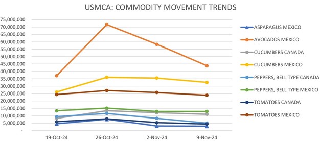 Movement from Mexico's crossings through Texas is expected to remain about the same. Trading of 32-40s is active, while others are moderate. Supplies of 32-40s are very light. Prices of conventional are higher, organic prices are generally unchanged. Cartons of 2-layers Hass 32-36s are mostly 72.25- 74.25, 40s are mostly 67.25-70.25, 48s are mostly 54.25-55.25, 60s are mostly 32.25-34.25, 70s are mostly 21.25-23.25, and 84s are mostly 17.25-18.25; organic 48s are mostly 65.25-68.25, 60s are mostly 44.25-48.25, and 70s are mostly 36.25-38.25. Extra services are included.