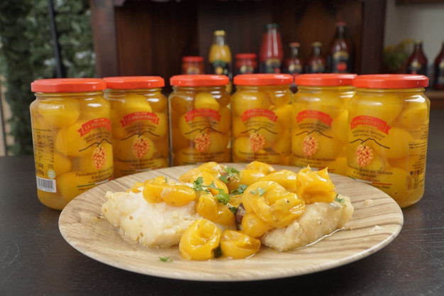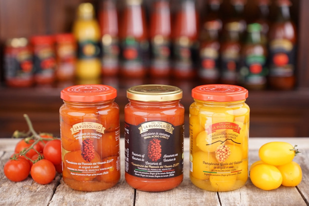 "Our sauce, available in 660 g glass jars, is our flagship product: it boasts all the characteristics of a totally natural artisanal product, with the raw material processed fresh without the use of acidity regulators. Sorting in the fields and harvesting at the right degree of ripeness, combined with processing in a bain-marie, always make the difference in terms of taste and organoleptic properties. The range also includes a line with a territorial outlook, where Pomodorino del Piennolo DOP stands out, also available in the yellow variant, in water and salt."