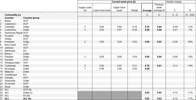 Honduras experienced the sharpest fall among the group, with prices dropping from £0.93 to £0.66, a notable £0.26 reduction (29%). Similarly, Panama saw its weekly average dip from £0.94 to £0.85, reflecting a smaller yet significant change of 10%.