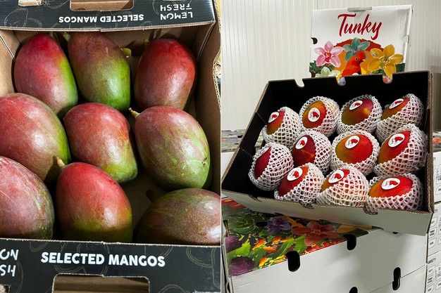 On the left: Brazilian Palmer mango shipped by sea; on the right: Kent mango shipped by air from Peru