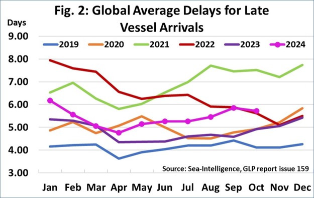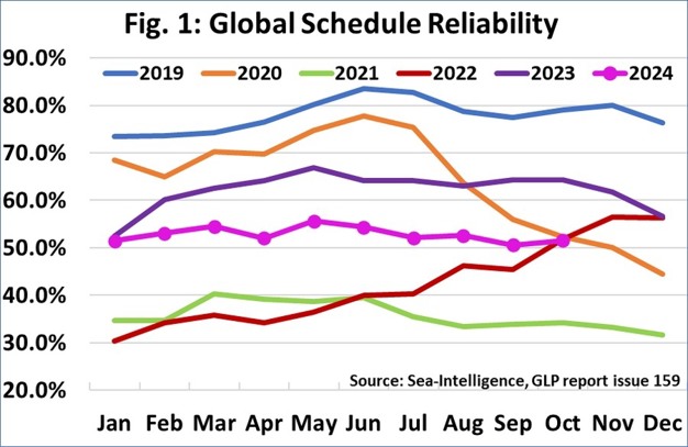 Sea-Intelligence has published issue 159 of the Global Liner Performance (GLP) report, with schedule reliability figures up to and including October 2024. As the report itself is quite comprehensive and covers schedule reliability across 34 different trade lanes and 60+ carriers, this press release will only cover the global highlights from the full report.