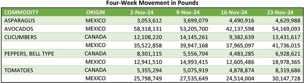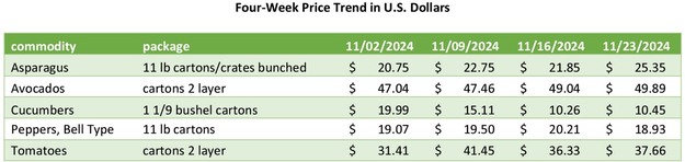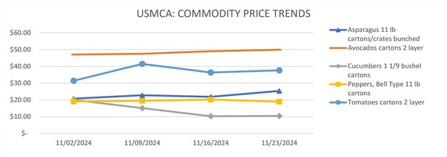 11-pound cartons of bunched jumbo are mostly 28.75-28.95, extra-large are mostly 24.75, large are mostly 23.75-24.75, standard are mostly 21.75-22.75, small are 20.00-20.75. Quality is generally good. Movement from Mexico crossings through Arizona, California, and Texas is expected to remain about the same. 11-pound cartons/crates and bunched supplies are insufficient to establish a market as most present shipments are for previous commitments and/or prior commitments. The F.O.B. report is expected to resume by November 27.