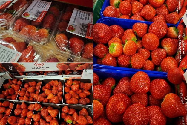 Insight into the Dehmel strawberry range. Clockwise: Egyptian flight strawberries, Dutch greenhouse strawberries and Belgian greenhouse strawberries from Coöperatie Hoogstraten.
