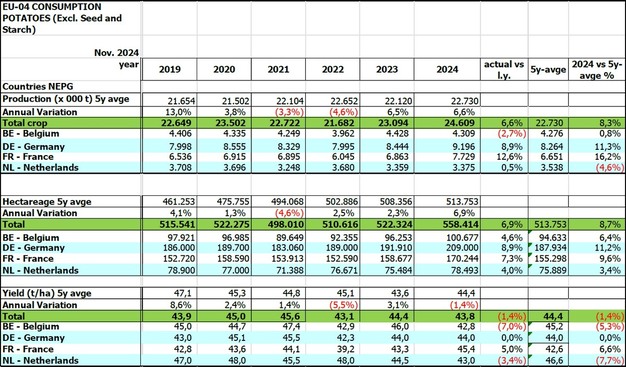 2024 yields (43.8 t/ha) are 0.6 t/ha below the 5-year average (44.4 t/ha) as well as last year's average yield (44.4 t/ha). Yield ranges throughout the NEPG zone varied significantly, from less than 20 t/ha to over 70 t/ha, largely depending on planting dates. The total EU-04 hectarage expanded by 37,700 ha (+7.2%), and total production rose by 6.9% to 24.6 million tons (+1.6 million tons). At the same time, processors' needs have also increased.