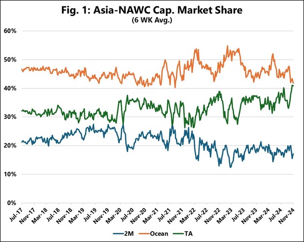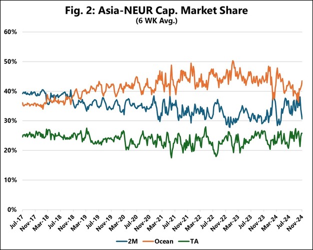 Capacity market share is an interesting metric to see the extent of the presence of a carrier alliance in any given trade. Figures 1 and 2 show this for the existing three alliances throughout their life cycle so far for Asia-North America West Coast and Asia-North Europe. These figures are in isolation and only show the capacity market share within the alliances.
