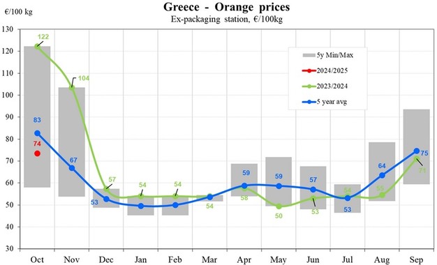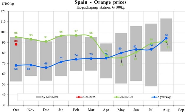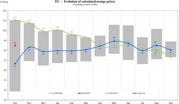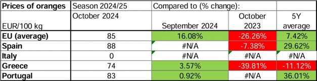 Portugal reported orange prices at €83/100kg in October, a modest 0.92% rise from the previous month. These prices are 36.01% higher than the five-year average, indicating a relatively stable market performance compared to other EU countries. In contrast, Italy did not report specific orange price data for the period, limiting broader regional comparisons.