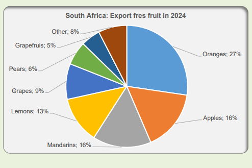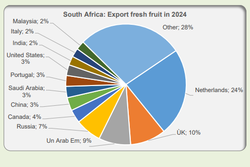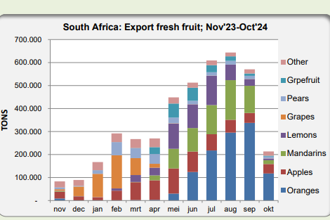 Fruit exports from South Africa have seen a slight recovery this year after declining in 2023. At 4.17 million tons, exports this year are 2% higher than in 2023 but still 2% lower than the record of 4.25 million tons in 2022.