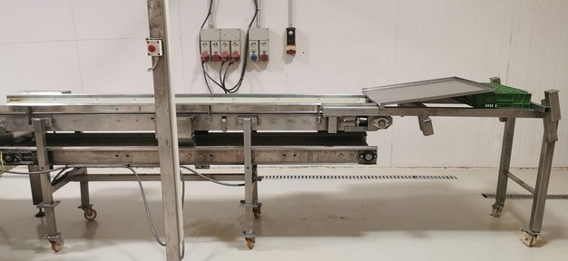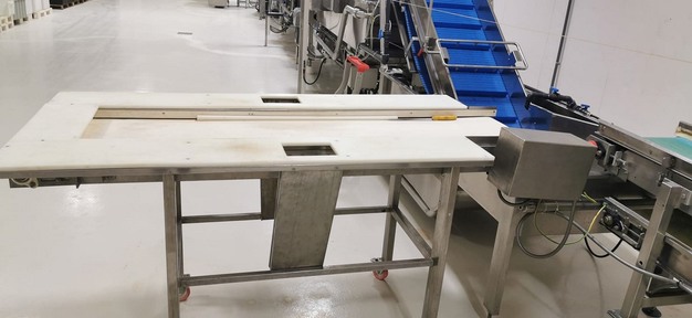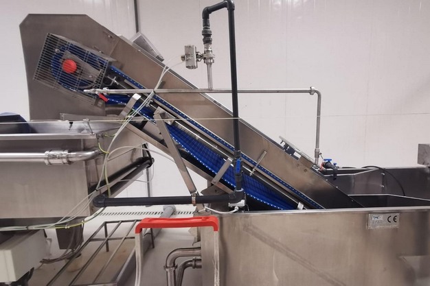 The fresh-cut range line for vegetables is composed of three tanks with attached conveyor belts for baby lettuce and lettuce, a centrifuge, and a cutter.