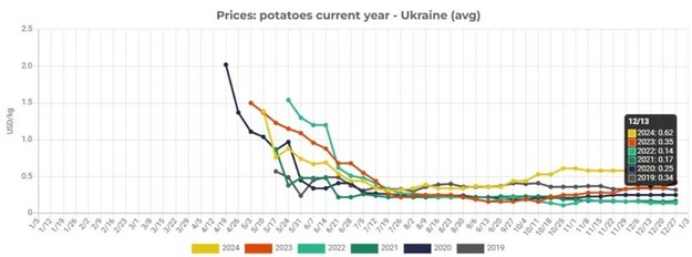 Prices for potatoes are currently ranging between 22-30 UAH/kg ($0.53-0.72/kg), marking an average increase of 22% from the previous week. This rise in trading activity is attributed to the growing interest from wholesale companies and retail chains, which are beginning to stock up for the New Year holidays. While further increases in prices are not dismissed, a sharp rise is deemed unlikely.