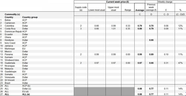 The data provided outlines the current week's average prices and the previous week's average prices for key exporting countries, including Colombia, Costa Rica, Mexico, and Guatemala. These figures show notable changes in weekly pricing trends, highlighting shifts in market conditions for each country. For Colombia, the current week's average price stands at £0.79, while the previous week's average was £0.70, reflecting an increase of £0.08 or 12%. This upward movement indicates stronger market demand or reduced supply for Colombian exports compared to the previous week.