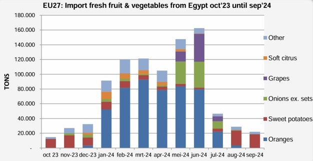 Egyptian sweet potatoes are present on the EU market from August to December. Egyptian onions are mainly available in May and June, while Egyptian grapes are prominent in June.