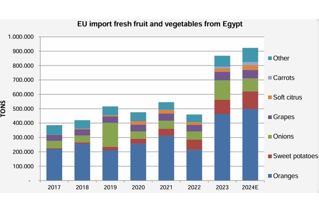 In Egyptian exports of fresh fruit and vegetables to the EU, oranges remain the dominant product, with a quantity of 500,000 tons projected in 2024—an 8% increase from 463,000 tons in 2023. In 2022, the figure was 215,000 tons, and in the previous year, it was 310,000 tons.
