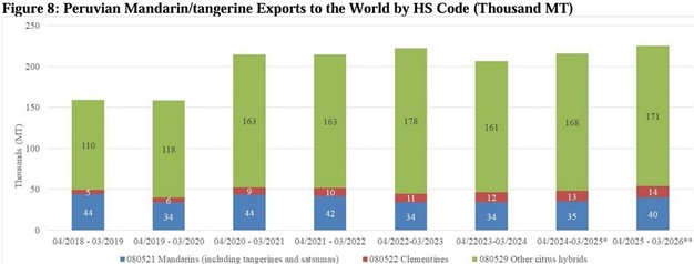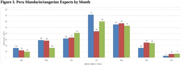 Historically, summer in Peru (December 2024 to March 2025) is the rainy season, however, rainfall along the coastal zone (where much of the mandarins/tangerines are produced) is expected to receive a low amount of precipitation. Mandarin/tangerine production will continue its upward trend.