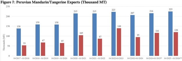 Peruvian mandarin/tangerine production and exports are expected to increase by two and four percent, respectively in MY 2024/2025 (April 2025 to March 2026). Production is forecast to reach 570,000 metric tons (MT), while exports are forecast at 225,000 MT. Higher productivity is driven by favorable La Niña climatic events contributing to below-average temperatures. Domestic consumption of fresh mandarins/tangerines is forecast at 320,000 in MY 2024/2025, a one percent increase from the previous year. The United States will likely remain Peru's top export partner.
