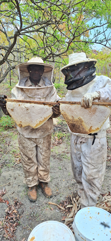 Right: Heinrich van der Merwe with a beekeeper whom he has trained