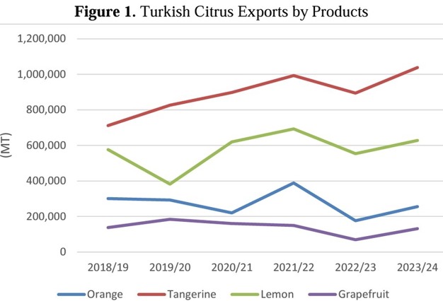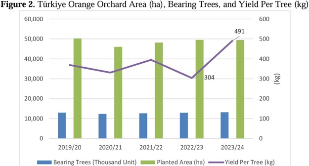 In MY 2023/24 Türkiye produced 2.3 MMT of oranges, which was 74 percent higher than MY 2022/23 (1.32 MMT) due to favorable weather conditions in spring 2023. The yield increase was mostly seen in the Washington variety, especially in the Aegean region, which accounts for 70 percent of total orange production in Türkiye. In MY 2023/24 yield per tree increased 62 percent when compared with the previous year