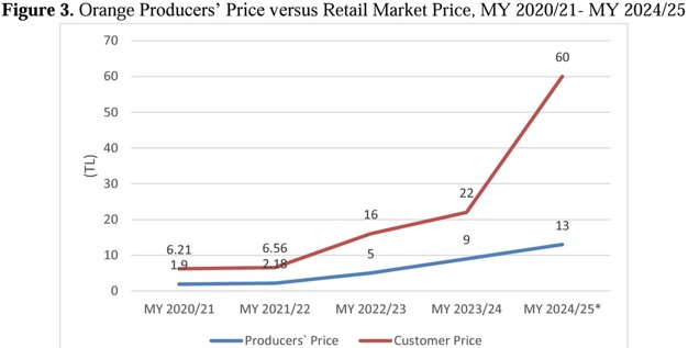 Most of the orange production in Türkiye can be found in the Antalya province. Farmgate prices have increased this season due to the low yield, however, they remain below production cost. Moreover, the price gap between the farmgate and supermarket is high due to rising costs related to transportation, storage, and middlemen in the supply chain.