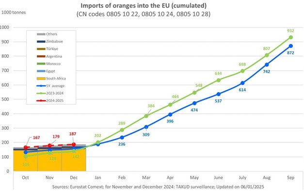 EU orange imports reached 187,168 tonnes from October to December 2024, reflecting a 41% increase compared to the five-year average for the same period. South Africa accounted for the majority, exporting 154,601 tonnes, followed by smaller contributions from Egypt (3,248 tonnes), Türkiye (2,899 tonnes), and others. Average orange prices in the EU dropped to €93 per 100kg in December, down from €98 in November, with notable price variations among Spain (€76), Italy (€143), and Greece (€53).