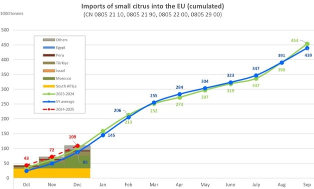 Small citrus imports totaled 109,362 tonnes during the first quarter of the 2024/25 season. Morocco emerged as the leading supplier, contributing 41,657 tonnes, followed by South Africa with 33,384 tonnes. The average price in December stood at €119 per 100kg, higher than the previous season's €112. Italy reported the highest prices at €163 per 100kg, indicating strong demand for premium quality citrus.