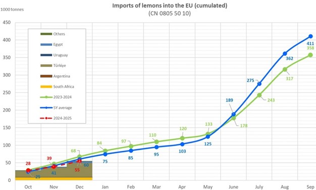Lemon imports declined to 54,949 tonnes between October and December 2024, compared to the previous season's 67,616 tonnes for the same months. Türkiye remained the dominant exporter with 39,771 tonnes. Average lemon prices decreased to €117 per 100kg in December, with Spain and Italy maintaining higher price points of €119 and €122 per 100kg, respectively.