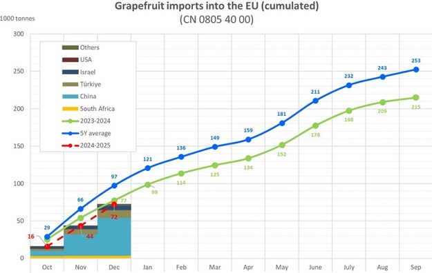 Grapefruit imports reached 72,195 tonnes during the reporting period. China led the supply chain, exporting 50,835 tonnes, followed by Türkiye (10,633 tonnes) and Israel (5,411 tonnes). Average prices across the EU fell slightly to €117 per 100kg in December, with significant contributions from premium suppliers helping to sustain quality standards.
