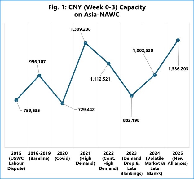 On the Asia–North America West Coast trade lane, a significant capacity increase is projected for the 4-week CNY period (the week of CNY and the three weeks following). Current deployment for 2025 is nearly 1.34 million TEU, marking the highest level across the analyzed period and surpassing even the high-demand conditions of 2021. This represents a year-on-year increase of 33.3% and a 34.1% rise compared to the 2016–2019 average, despite no clear demand growth to justify this surge.