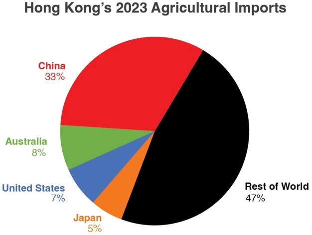 In 2023, Hong Kong was the 17th-largest market for U.S. agricultural products globally. That same year, the United States exported $1.5 billion of agricultural products and was the third-largest supplier of consumer-oriented food products to Hong Kong after China and Australia. Hong Kong is a significant market for U.S. exports of beef, poultry, tree nuts, and other agricultural products. Hong Kong's total imports of agricultural products were $19.7 billion, and its economy grew 3.3 percent in 2023.