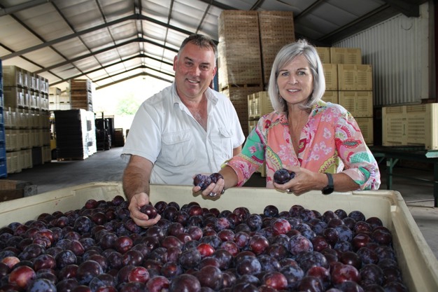 William Bourbon-Leftley, farmer, inspecting newly picked plums in the packhouse with Annelie Haumann, Stems Fruit CEO
