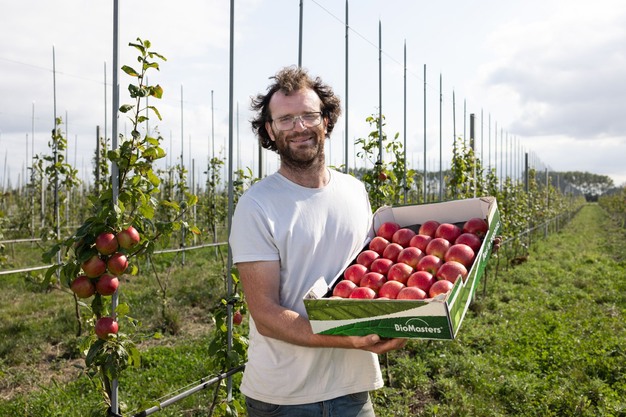 Biodynamic fruit grower Tim Moerman, owner of Loverdale Ter Linde in Oostkapelle, has been part of BioMasters since its inception. His farm is the oldest biodynamic farm in the Netherlands, established in 1926. From its dedicated organic grading station in Kapelle, BioMasters serves the market with 5 million kilos of soft and top fruit capacity. Tim is also actively involved in promoting organic farming in the Netherlands. Since taking over the farm in 2017, he has transformed it into a fully biodynamic operation, integrating fruit growing, arable farming, and livestock farming. The 30-hectare orchard, which produces apples, pears, and nuts, has been continuously optimized. In collaboration with BioMasters, Tim conducts trials on new varieties and contributes to discussions about the future of the organic sector.