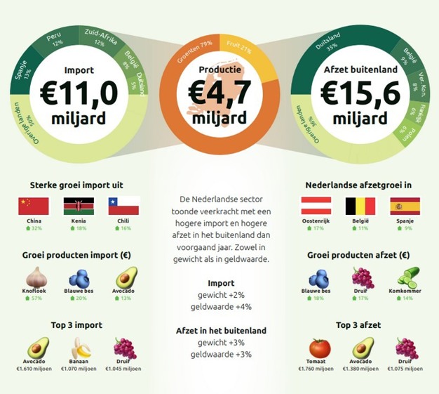 "Despite declining domestic consumption and challenging conditions, the Dutch fruit and vegetable sector has once again demonstrated its resilience and strong position in the international market. However, it remains worrisome that Dutch consumers are becoming increasingly distanced from healthy food recommendations. The sector will continue its commitment to sustainable production, healthy choices, and reliable availability, aiming to encourage consumers to eat more fruit and vegetables: the healthiest food with the lowest environmental footprint."