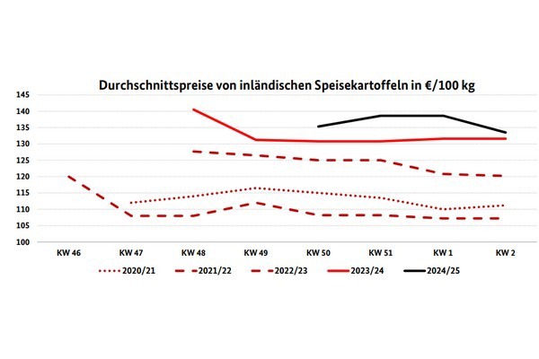 The potato market situation is currently described as calm. Demand did not drop as sharply as feared after the holiday season. Also, there are hardly any loads of poor quality in the warehouses in this country at the moment, so the focus is now on the good quality loads. For this reason, the range of producer prices continues to narrow as the lower range has been raised again. According to market participants, further storage surcharges are to be expected in the second half of the month. On the EEX, potato prices continued to rise slowly but steadily, with the result that the most actively traded April contract is now just under 31 EUR/dt. This level was last reached in August last year and there are currently no signs of a decline in prices.