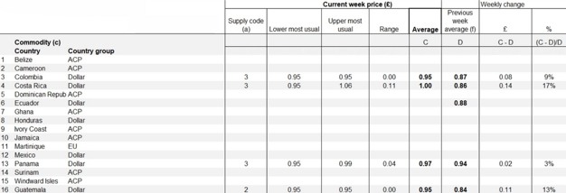 Guatemala displayed a significant price jump, with the average price increasing from £0.84 to £0.95, representing a 13% rise. This notable change suggests potential factors such as increased export costs or seasonal shifts impacting production. Such a rise in Guatemala's banana prices underscores the volatility in global agricultural markets.