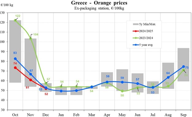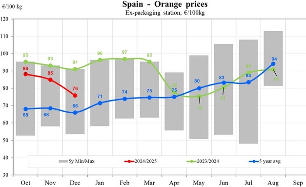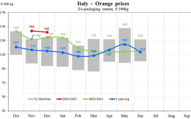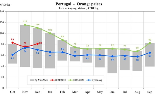 Finally, in Portugal, orange prices in the 2024/2025 season began at €83/100. While prices declined to €76/100 kg by November and climbed again to €81/100 kg by December, they remained consistently below the 2023/2024 values.