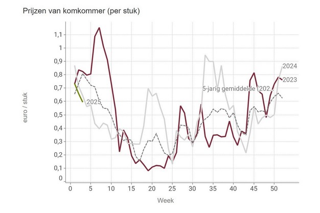 For cucumber, the same is not true. Here the middle price has been falling since the start of the new year, to now 59.4 euro cents per head on average over week 3.